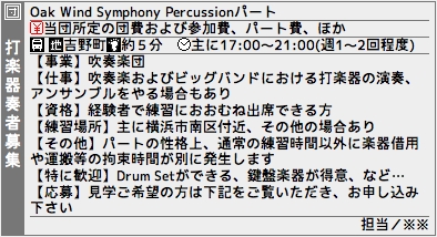 3. 求人情報 2011.06.01 演奏会前やコンクールシーズンは募集を停止しています。 最新の募集状況は当団の見学窓口にご確認ください。 打楽器特有の事情ですが、練習が進むとパート決めをしてしまうので、演奏会直後からの見学開始がおすすめです! 見学窓口へのリンクはこちら